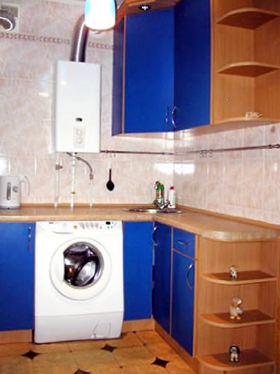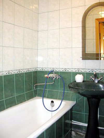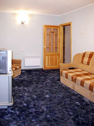 This newly remodeled 2 room apartment uses blue pastel colors to set a tranquil mood for your stay in Sumy. Plush carpeting, comfortable new furniture and rich hues of ceramic tile in the kitchen are comforting and enjoyable extras to this setting. The bedroom features a king size bed, always a plus. Entry is via a coded metal security door with and features a hidden alarm button.
